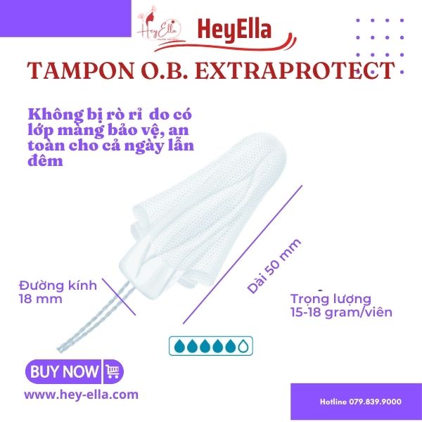 Tampon O.B ExtraProtect Super+Comfort với ký hiệu năm giọt trên bao bì, là loại tampon có kích cỡ rất lớn, độ thấm hút rất cao, dành cho những ngày có lượng kinh nguyệt vô cùng nhiều.